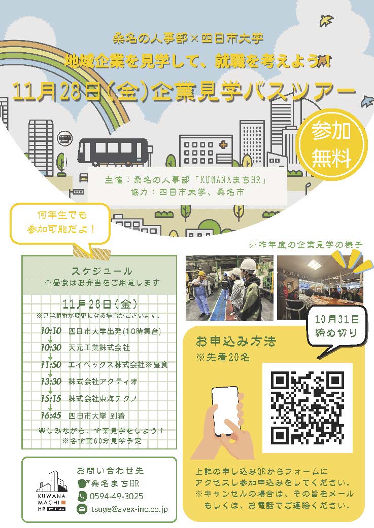 四日市大学に在学の方を対象に、地域企業の魅力を直接体感し、将来の就職先としての選択肢を広げてもらうことを中心に、企業見学バスツアーを実施しました。